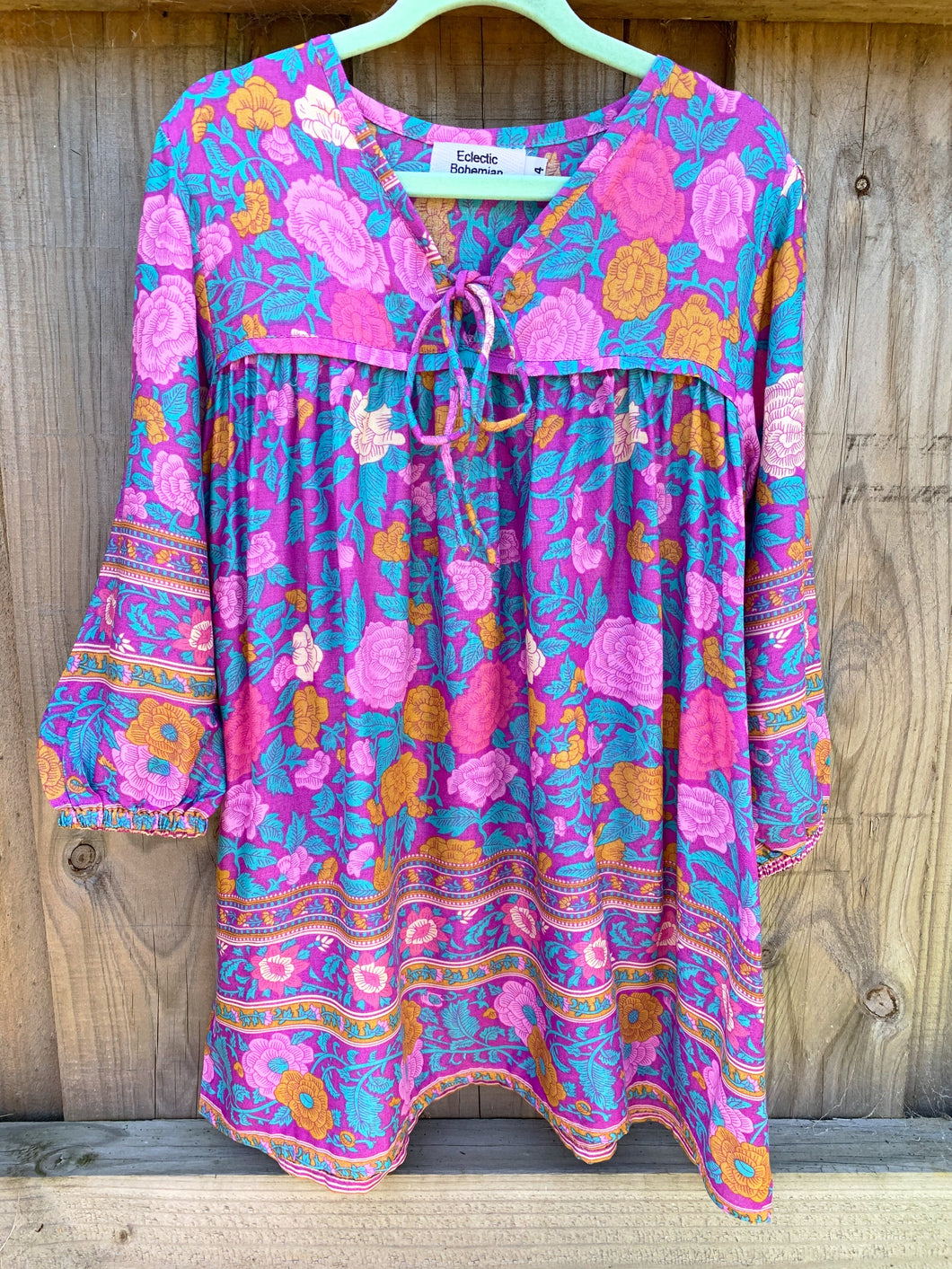 Say hello to our new adorable Bohemian Princess Mini Me girls dresses! Â Featuring a stunning bohemian floral print from Eclectic Bohemian, the soft and flowing 100% rayon fabric is soft on little bodies and cool in the warmer months. Elastic at the wrists and ties at the vneck and a border pattern trim, add boho style for your little princess.