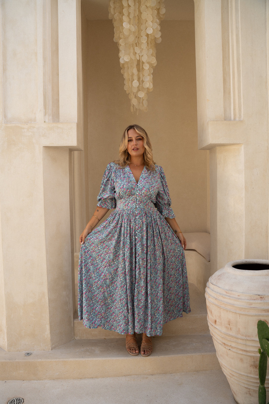 Our brand new style the Charlotte gown by Eclectic Bohemian has finally arrived for Spring/Summer, in the new Meadow floral print! This magical princess style gown is a romantic and feminine dress that is perfect for every boho goddess! Balloon puff sleeves to elbow length with a small frill, modest v-neck with a flat front panel that shapes under your bust. Made from our usual soft rayon fabric, in beautiful dainty floral print, with dusty blue background and tiny meadow flowers in hot and pastel pinks and a touch of peach. Buttons all the way down the front, that are fully functional and can unbutton completely. There is a soft shirred wide elastic waistband at the back only, with a full skirt that flares out from the waist. Length is around ankle height, not as long as our Fortune Teller Dress. We also have pockets!🌸