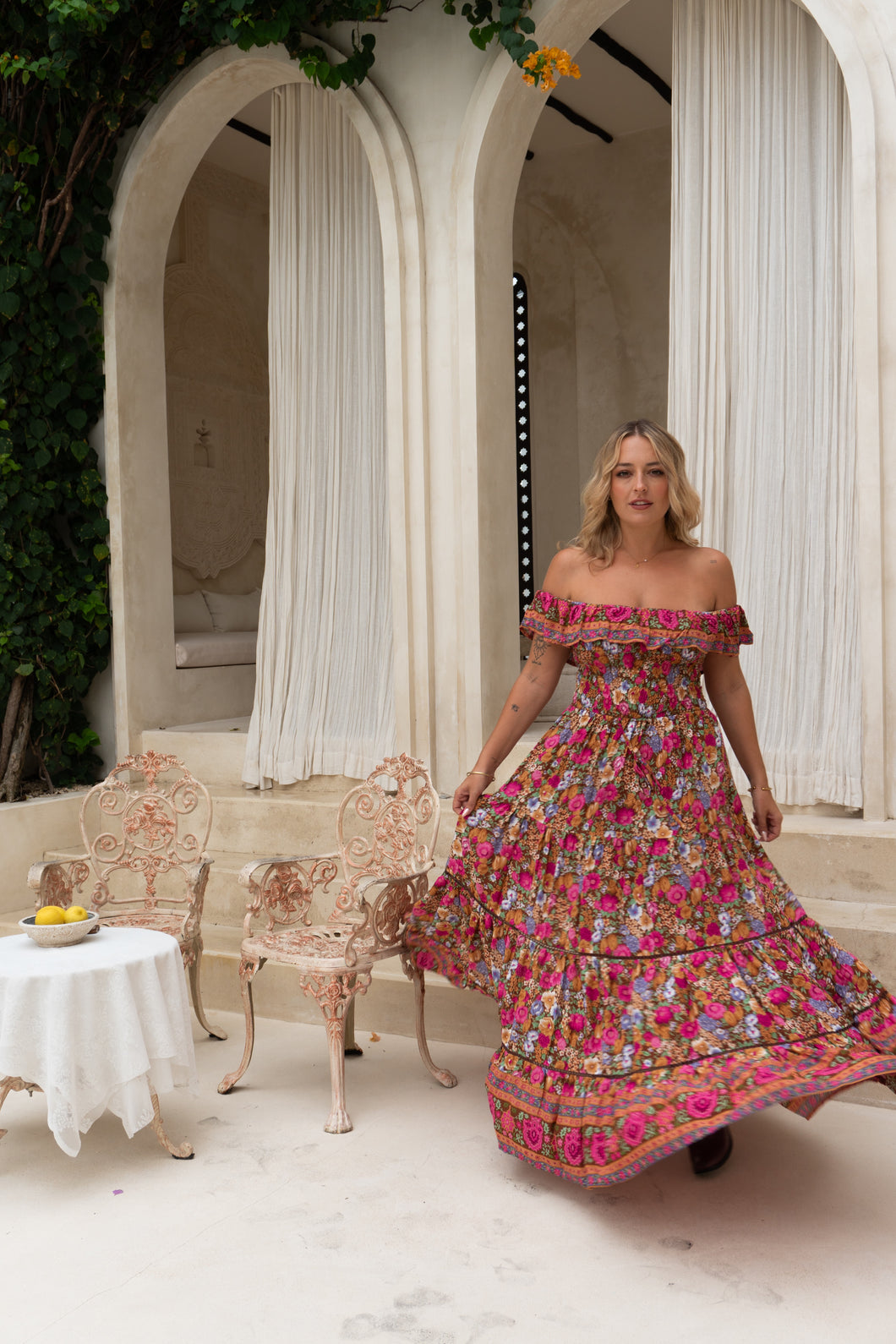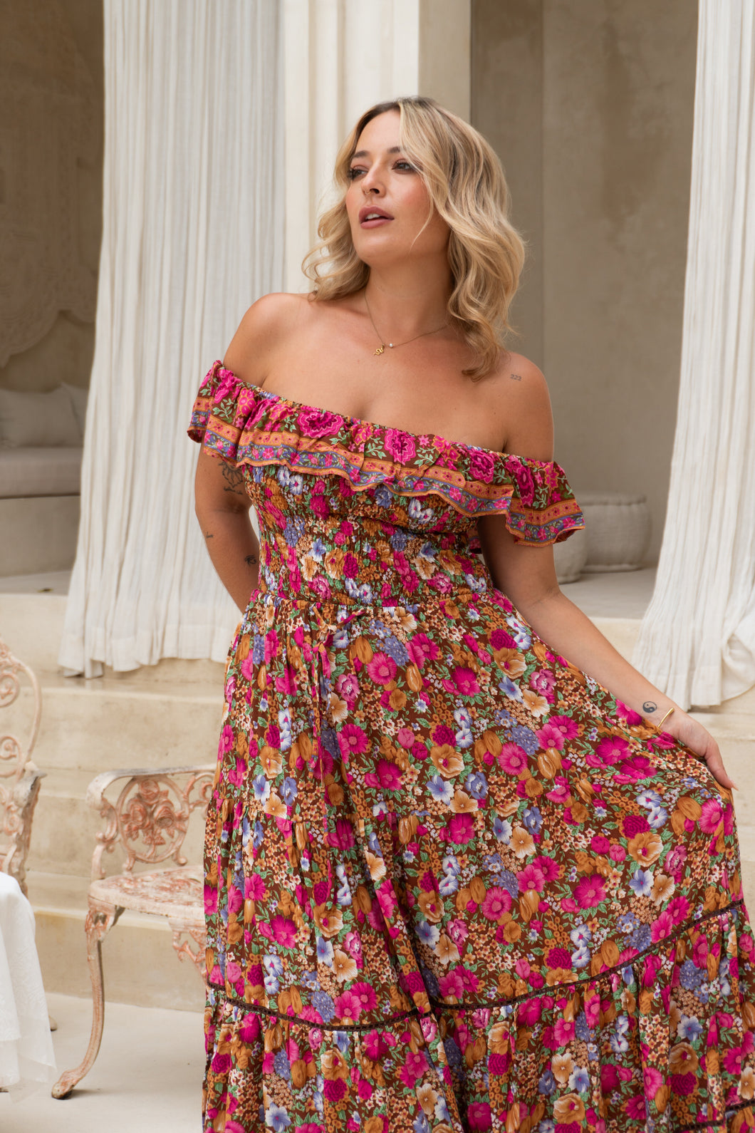 She’s back for our newest Summer Collection, Grace gown by our in house brand Eclectic Bohemian is back in a new Rose floral print! This gorgeous and sultry style maxidress is simply stunning! The deep frill across the bust and into the sleeve covers a fully shirred bodice. It is elasticated to allow the shoulders to be worn on or off. Made from our usual soft rayon fabric, in rose, pink lilac, green foliage and a chocolate background, with a feature border with large roses. There are 3 tiers in the full style skirt with ladder lace trim and drawstring at the waist. Can be worn as maternity dress due to stretchy elastic and perfect for breast feeding with the elasticated neckline. She also has pockets! 🌸